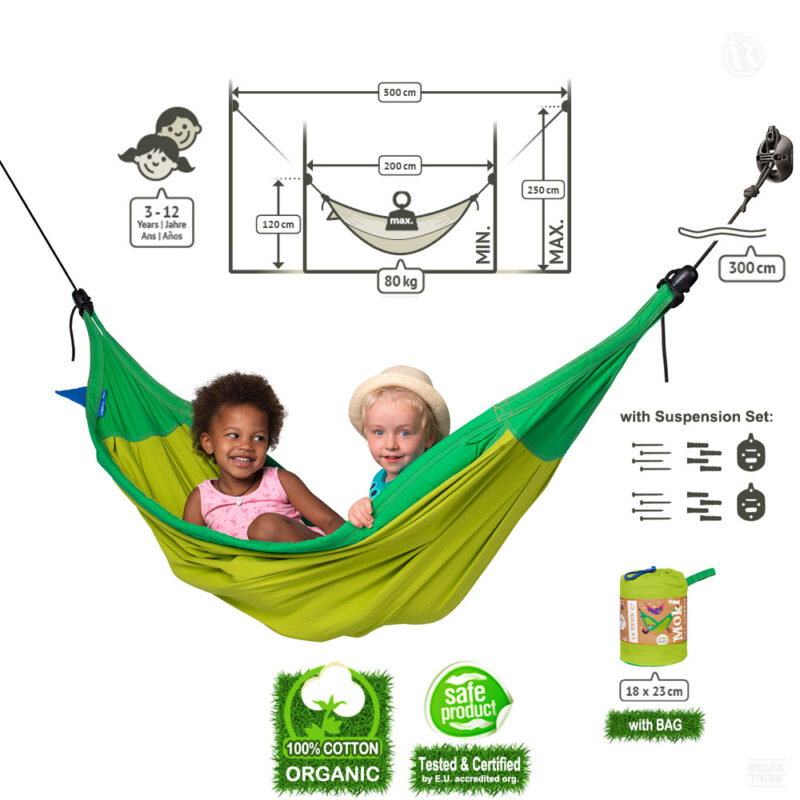 ![Moki Froggy: Kids Hammock [100%Organic Cotton] w/ Suspension [max.80kg/TÜV certified] Moki Froggy: Kids Hammock [100%Organic Cotton] w/ Suspension [max.80kg/TÜV certified] Lime+Green](https://relaxtribe.com/wp-content/uploads/moki-froggy-kids-hammock-pure-organic-cotton-with-suspension-max-80kg-lime-green-800x800.jpg)